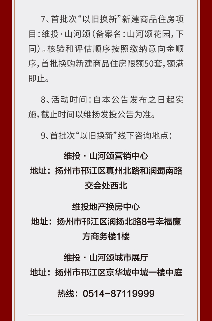 住房“以舊換新”“以房換房”是各地房地產(chǎn)新政中以“小細節”撬動(dòng)“大市場(chǎng)”的重要舉措。維揚發(fā)投積極響應政府新推行的“以舊換新”政策,踐行“惠民”理念,整合各項資源,搭建換房中心平臺,為買(mǎi)房人提供一站式以舊換新置換服務(wù),推動(dòng)激活邗江區商品房市場(chǎng)活力。 此次維揚發(fā)投“以舊換新”工作以其自主開(kāi)發(fā)的維投·山河頌項目為試點(diǎn),由國企背書(shū)、置換范圍廣、全流程專(zhuān)業(yè)服務(wù)。首批換購新建商品住房限額50套,換購人可通過(guò)登錄“維揚發(fā)投商品住房‘以舊換新’線(xiàn)上報名系統”報名,具體要求詳見(jiàn)公告。