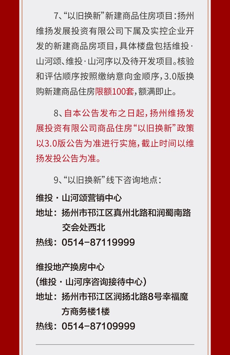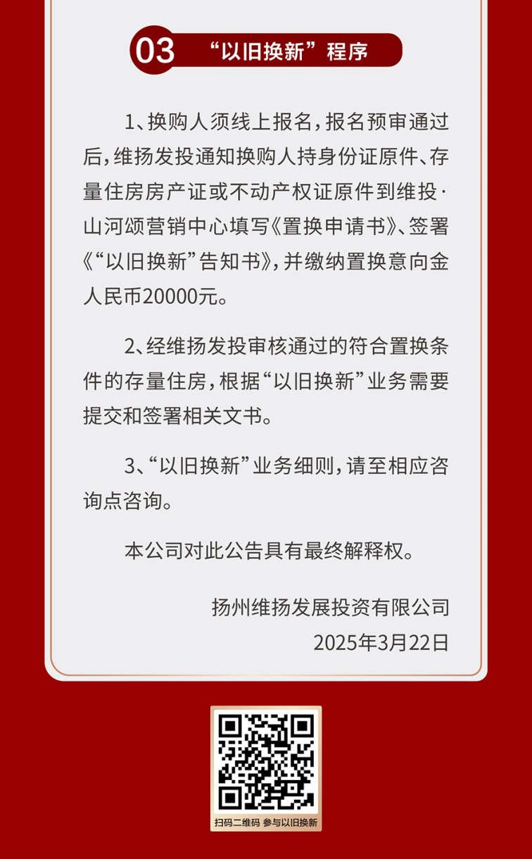 為進(jìn)一步滿(mǎn)足更廣泛客群對于更高居住品質(zhì)、更美好生活的改善需求,維投地產(chǎn)公布了“以舊換新”3.0版本,將維投·山河序也納入置換范圍,預計本周五(5月23日)正式啟動(dòng)置換流程,同時(shí)接受預約登記。