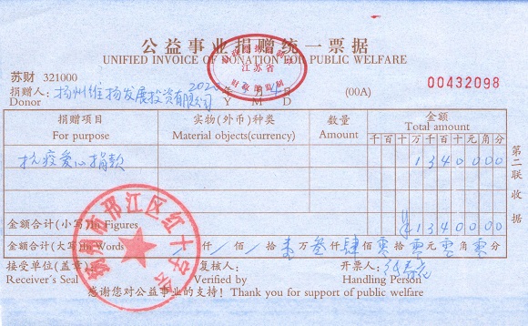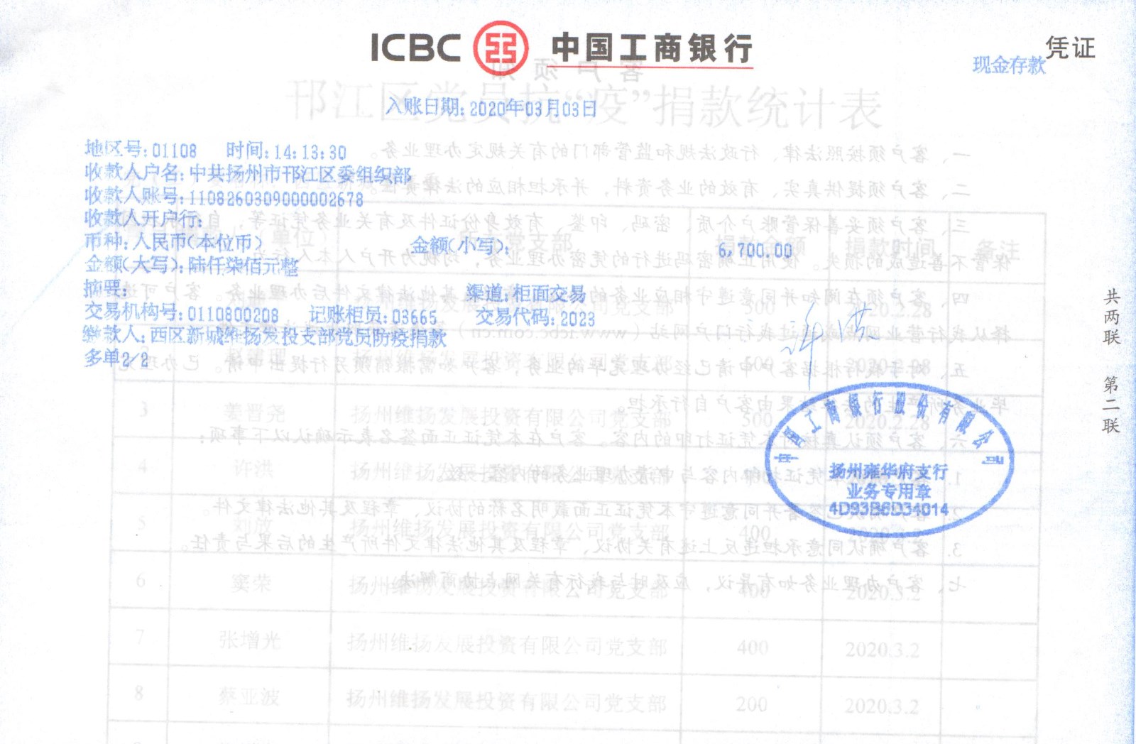為積極響應區委、區政府號召,表達公司黨員職工對疫情防控工作的堅定支持。3月3日下午,由公司黨支部牽頭,組織黨員干部、普通職工以及相關(guān)合作單位開(kāi)展自愿捐款活動(dòng),支持疫情防控。 公司黨支部書(shū)記、副董事長(cháng)劉迪平首先發(fā)起捐款倡議,“黨有號召,我有行動(dòng)”。班子成員緊隨其后,黨員職工及合作企業(yè)紛紛響應,踴躍捐款,用點(diǎn)滴愛(ài)心集聚起支援疫情防控的強大正能量。 涓流不吝,以成江河。截止目前,公司黨支部一共向邗江區委組織部賬戶(hù)匯入黨員抗疫特殊黨費6700元。公司員工及合作單位也籌集了13400元的抗疫愛(ài)心捐款,匯款至邗江區紅十字會(huì )。 疫情期間,我公司全體黨員干部職工,以實(shí)際行動(dòng)為疫情防控盡一份心意,詮釋了共產(chǎn)黨員和國企人的初心本色。