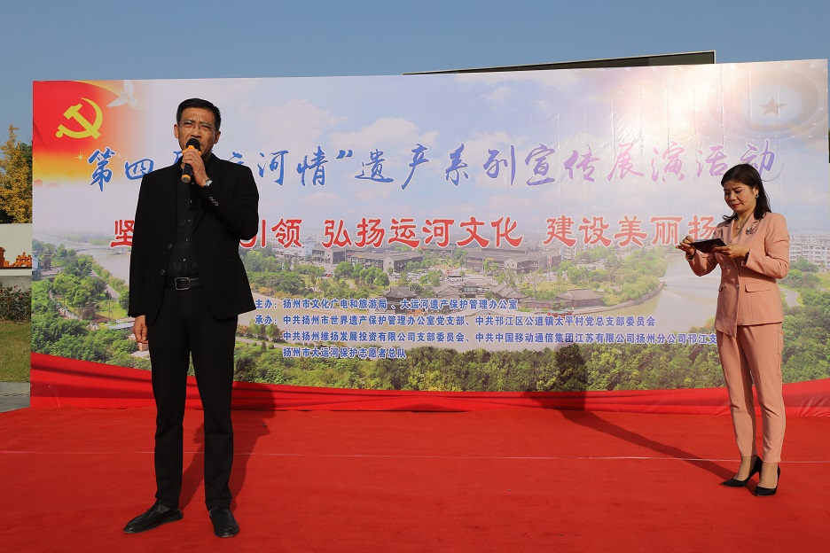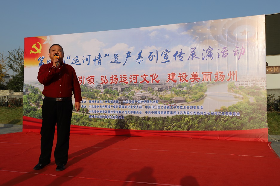 為充分發(fā)揮廣大市民在大運河遺產(chǎn)保護、傳承和利用中的重要作用,深入挖掘大運河的歷史、科學(xué)、文化價(jià)值,宣傳普及大運河遺產(chǎn)知識,11月8日下午,在蜀岡體育公園舉辦了以“堅持黨建引領(lǐng) 弘揚運河文化 建設美麗揚州”為主題的第四屆“運河情”遺產(chǎn)宣傳展演系列活動(dòng)。 本次活動(dòng)由揚州市文化廣電和旅游局、大運河遺產(chǎn)保護管理辦公室主辦,由中共揚州市世界遺產(chǎn)保護管理辦公室支部委員會(huì )、中共揚州市邗江區公道鎮太平村總支部委員會(huì )、中共揚州維揚發(fā)展投資有限公司支部委員會(huì )、中共中國移動(dòng)通信集團江蘇有限公司揚州分公司邗江支部委員會(huì )、揚州市大運河保護志愿者總隊聯(lián)合承辦。 活動(dòng)共有四個(gè)環(huán)節:首先,由專(zhuān)業(yè)人士解讀大運河文化帶建設相關(guān)政策和規劃。