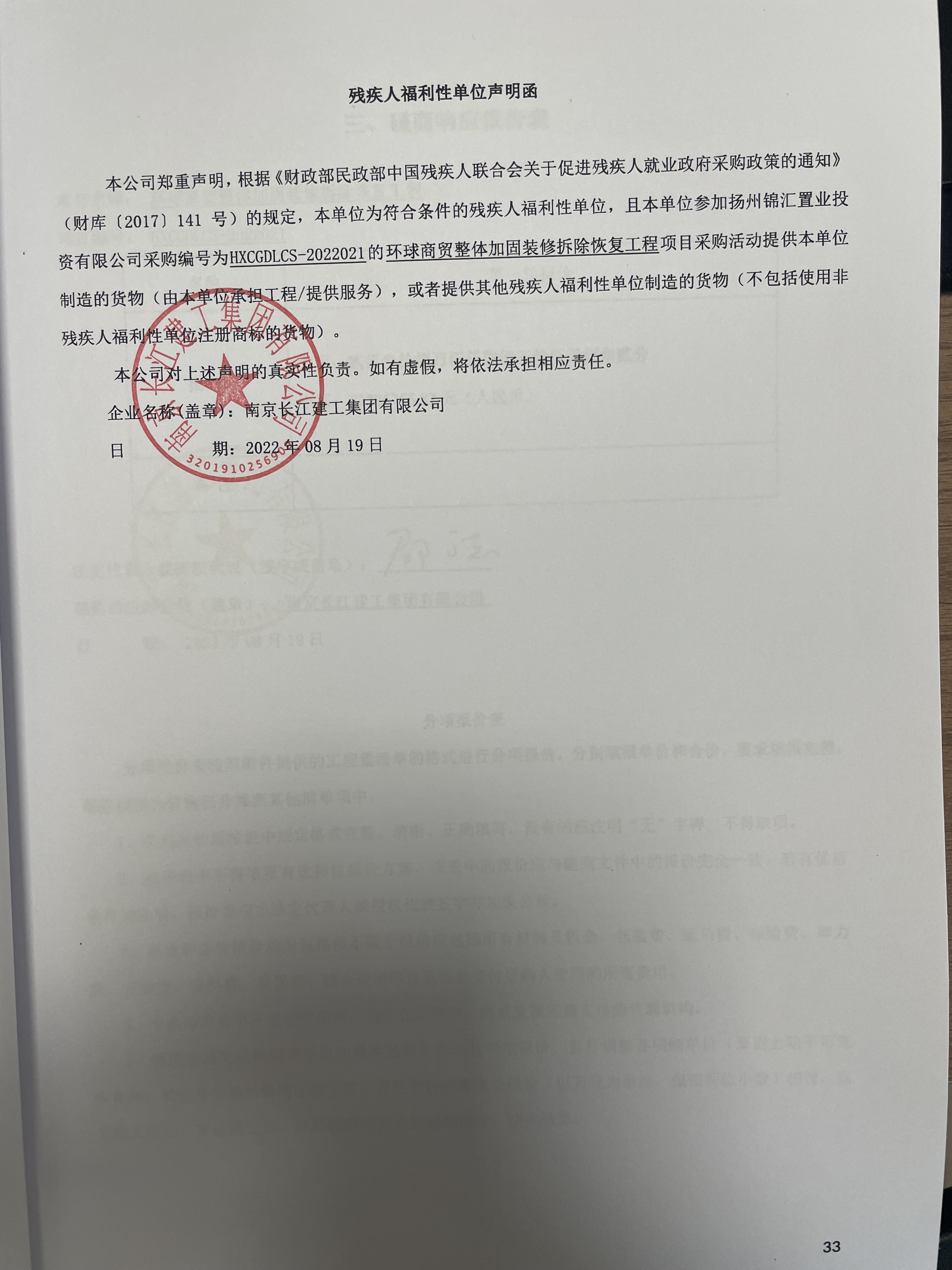 一、項目編號:HXCGDLCS-2022021號 二、項目名稱(chēng):環(huán)球商貿整體加固裝修拆除恢復工程 三、成交信息 供應商名稱(chēng):南京長(cháng)江建工集團有限公司 供應商地址:南京市江北新區葛塘街道浦六北路 成交金額:人民幣238.5萬(wàn)元 四、主要標的信息 工程類(lèi) | 名 稱(chēng):環(huán)球商貿整體加固裝修拆除恢復工程 施工范圍:包含但不限于環(huán)球商貿整體加固裝修拆除恢復工程工程量清單范圍內的所有施工內容。 施工工期:80日歷天 項目經(jīng)理:王俊 編 號:蘇232181901653 |
