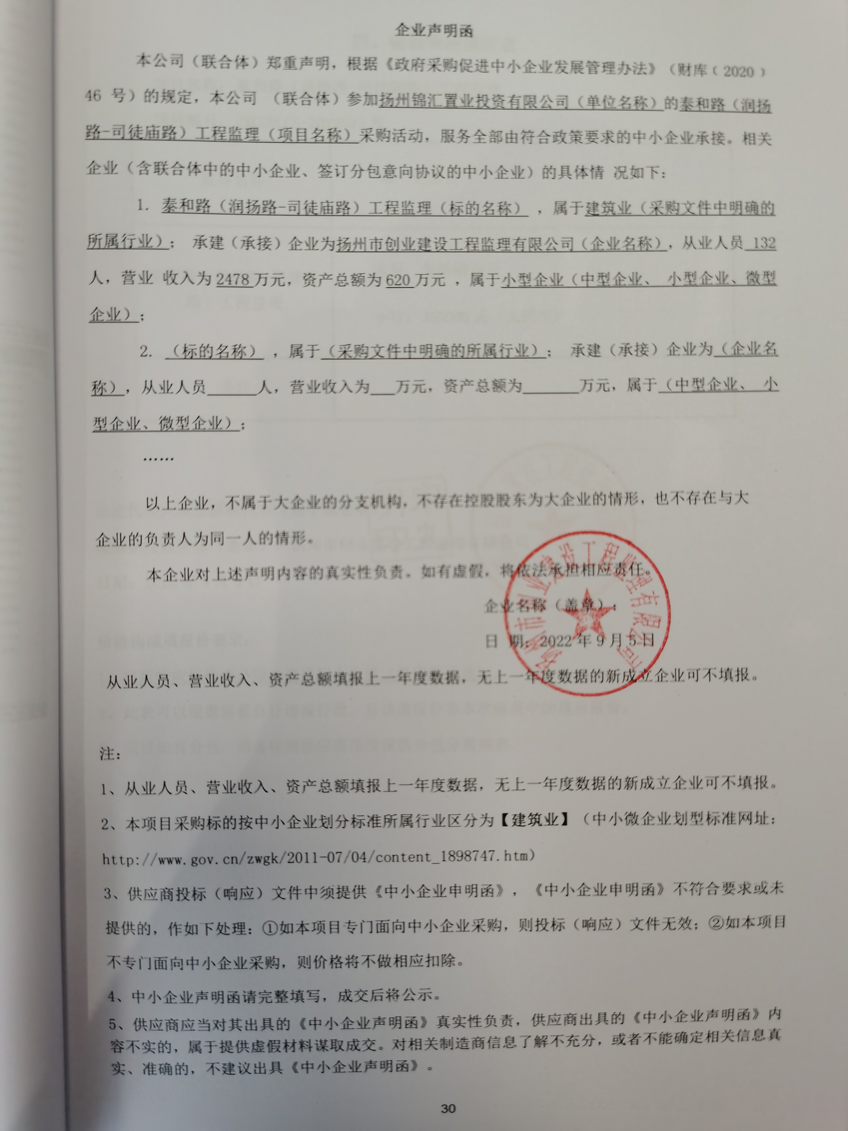 五、評審專(zhuān)家名單:劉慶芝 盧佩霞 馬東明 六、公告期限 自本公告發(fā)布之日起1個(gè)工作日。 七、其他補充事宜:無(wú) 八、凡對本次公告內容提出詢(xún)問(wèn),請按以下方式聯(lián)系 1、采購人信息 名 稱(chēng):揚州錦匯置業(yè)投資有限公司 2、采購代理機構信息 名 稱(chēng):宏信天德工程顧問(wèn)有限公司 地 址:揚州市國展路29號(星耀天地商務(wù)中心)2幢22層) 聯(lián) 系 人:劉香 聯(lián)系電話(huà):15952722500 3、項目聯(lián)系方式 項目聯(lián)系人:劉香 電 話(huà):15952722500 2022年9月6日 中小企業(yè)聲明函.jpg