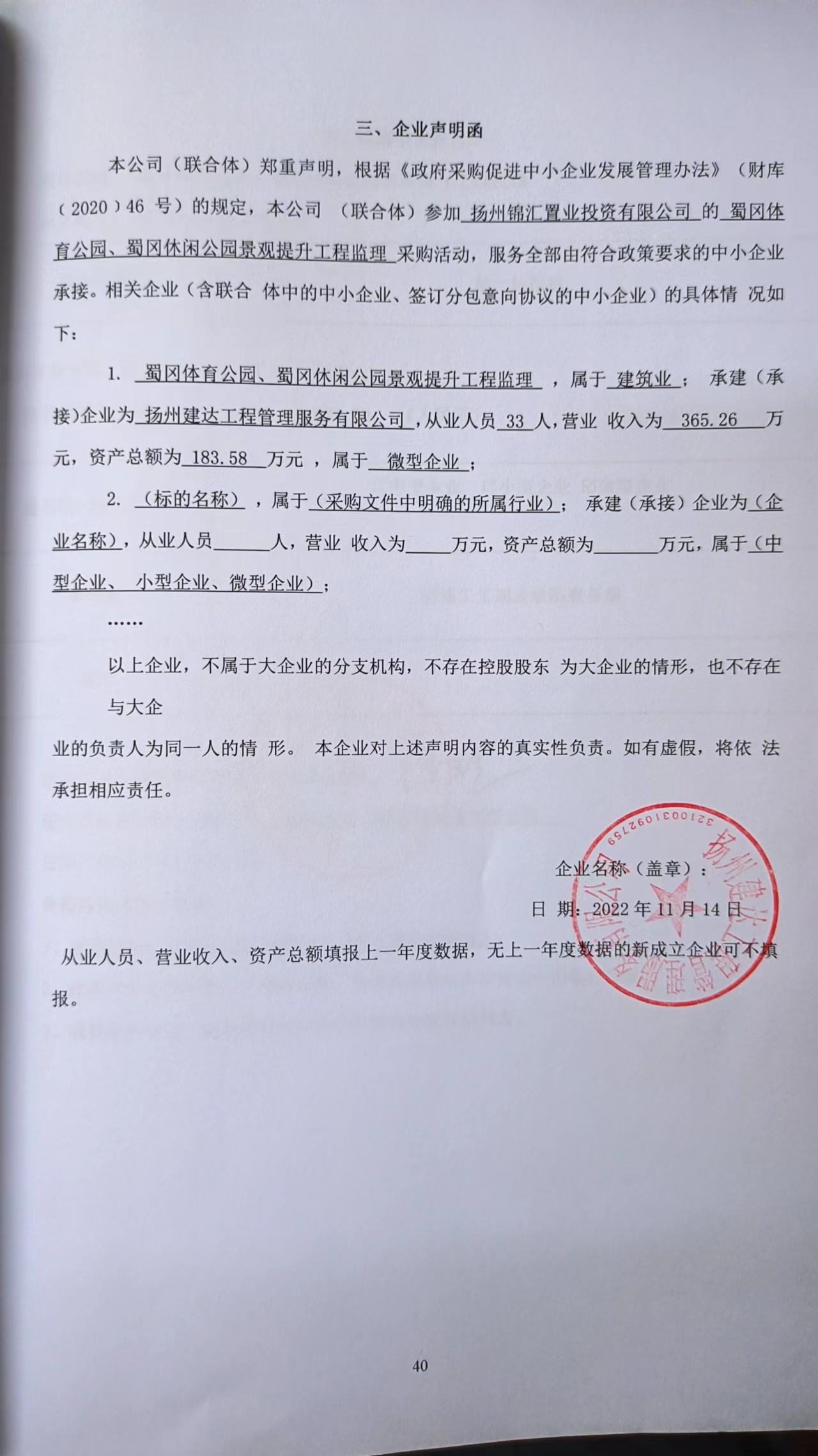 五、評審專(zhuān)家名單:董騫、姜小琴、徐亞萍 六、公告期限 自本公告發(fā)布之日起1個(gè)工作日。 七、其他補充事宜:無(wú) 八、凡對本次公告內容提出詢(xún)問(wèn),請按以下方式聯(lián)系。 1.采購人信息 名 稱(chēng):揚州錦匯置業(yè)投資有限公司 地 址:揚州市邗江區潤揚北路8號幸福魔方商務(wù)樓6樓 聯(lián)系方式:李工 0514-82120352 2.采購代理機構信息 名 稱(chēng):江蘇唯誠建設咨詢(xún)有限公司 地 址:揚州維揚路106-1號,揚州商城國際大廈19F 聯(lián)系方式:0514-87880356 3.項目聯(lián)系方式 項目聯(lián)系人:謝工 電 話(huà):0514-87880356 小微企業(yè)聲明函.jpg