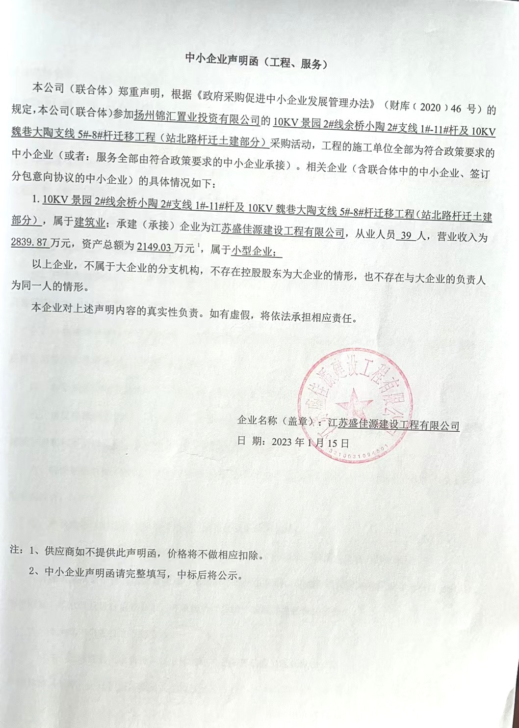 五、評審專(zhuān)家名單:陳艷、陸桂華、余輝 六、代理服務(wù)收費標準及金額:本項目代理費由中標人支付。 七、公告期限:自本公告發(fā)布之日起1個(gè)工作日。 八、其他補充事宜:無(wú)。 九、凡對本次公告內容提出詢(xún)問(wèn),請按以下方式聯(lián)系。 1、采購人信息 名 稱(chēng): 揚州錦匯置業(yè)投資有限公司 2、采購代理機構信息 名 稱(chēng):揚州筑苑工程招標咨詢(xún)有限公司 地 址:揚州市潤揚北路19號 聯(lián) 系 方 式:0514-87116778 項目聯(lián)系方式 項目聯(lián)系人:李斌 電 話(huà):0514-87116778 2023年1月18日 中小企業(yè)聲明.jpg